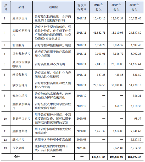 由上图可知,厄贝沙坦片、厄贝沙坦氢氯噻嗪片、氯沙坦钾片、伏立康唑片在2020年的收入同比有所增加。其中,厄贝沙坦氢氯噻嗪片在2020年的收入较集采前“收益颇丰”;而安立生坦片、盐酸多奈哌齐片、奥氮平口崩片和缬沙坦片受益于集采,收入由无到有。盐酸多奈哌齐片于2019年中标后,在2020年迅速放量,销售收入高达2810.35万元;同年入围第三批集采清单的缬沙坦片在2020年也取得了2127.82万元的亮眼成绩。