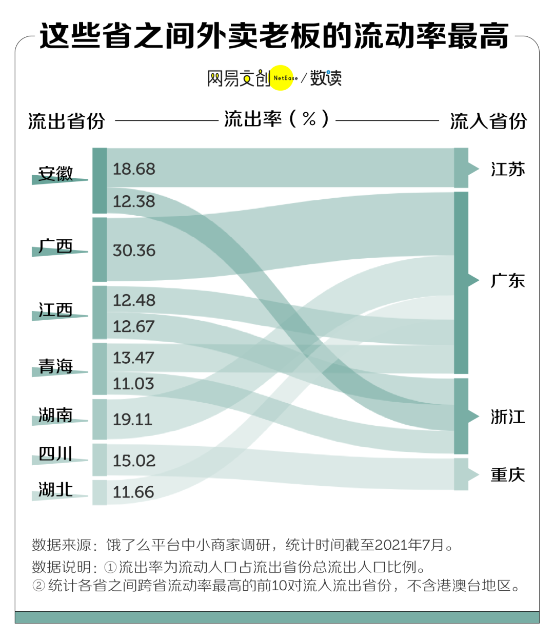 例如广西的外卖老板中,有高达 30% 的都是去了广东。两个省份地理上相邻,且广东经济发展好,人口稠密,餐饮外卖需求大,自然对广西老板充满了吸引力。