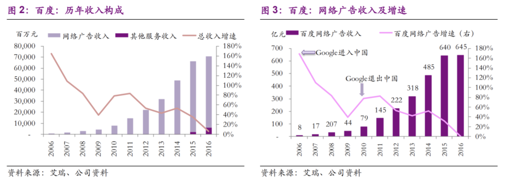 2016年,百度营业收入同比仅增长了6%(2015年同比增长35%),净利润同比下降了65%,搜索广告收入增速首次下滑至个位数。百度在全国网络广告市场中的市占率也有所下滑,从2015年的31%下降至23%,被阿里巴巴夺走市占率第一的席位。