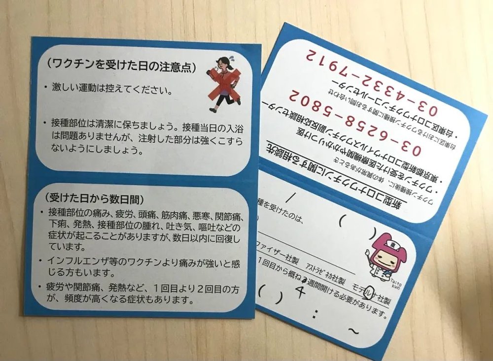 于是四周后,同样的周五,我又走了一遍差不多的流程。唯一的区别就是女医生问诊的时候多提醒了我一句:第二针打完后一般都会发烧两天的,难受的话可以去附近药店买点药,实在严重的话就打这个电话,又给我塞了一张跟上次一样的小卡片。