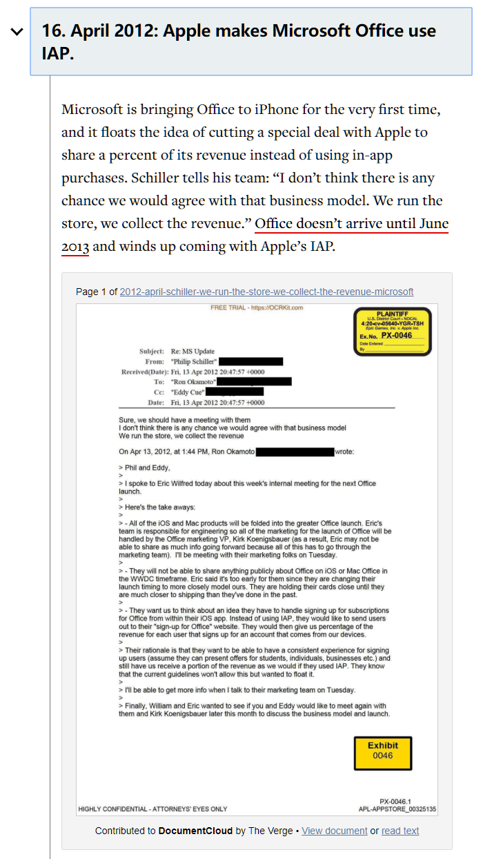 比如在 2012 年的时候,苹果就要求微软的 Office 套件在 iOS 端购买的时候,必须采用内购的方式来付费。