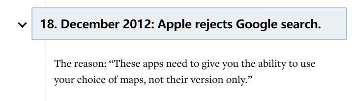 也是同一年,在 iPhone 上的谷歌搜索因为没能提供除谷歌地图之外的选项,而遭到苹果下架。