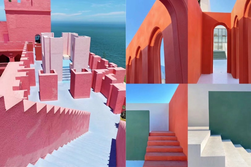 “小纪念碑谷”的选择范围则宽广得多。尽管游戏《纪念碑谷》的原型——西班牙阿利坎特卡尔佩小镇的“红墙”以粉红色与蓝色为主,但国内的小纪念碑谷显然非常擅长举一反三,一股脑把深浅不一的橙色、绿色、黄色、红色给用了个遍。