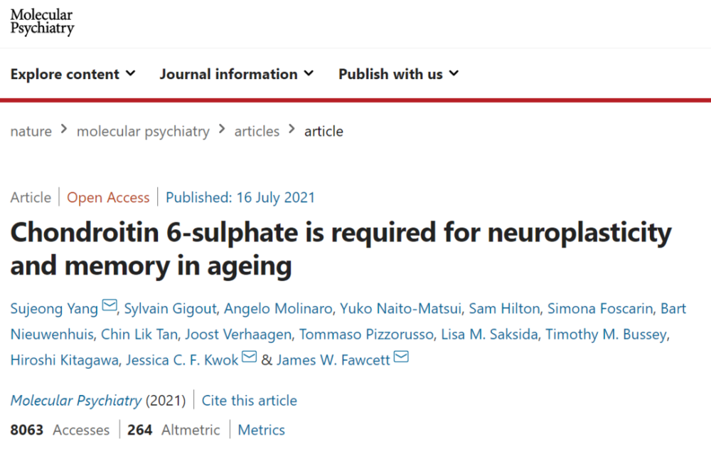 [1] Yang, S., Gigout, S., Molinaro, A. et al. Chondroitin 6-sulphate is required for neuroplasticity and memory in ageing. Mol Psychiatry (2021). https://doi.org/10.1038/s41380-021-01208-9.
