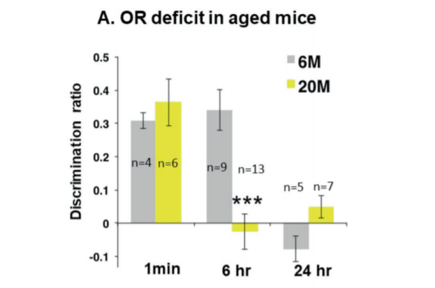 本次研究主要通过年轻小鼠和衰老小鼠的记忆水平认知的对比,来确定6-硫酸软骨素水平对于记忆水平的影响。研究中一组小鼠为6个月龄,相当于人类16岁左右;另一组小鼠则是20个月龄,相当于人类55岁左右。通过记忆测试发现:20个月龄的小鼠出现了明显的记忆衰退的情况——6个月的小鼠在接触新物体6个小时后产生记忆,24小时后遗忘;20个月的小鼠在6个小时左右,就已经失去了对于新接触物体的记忆。