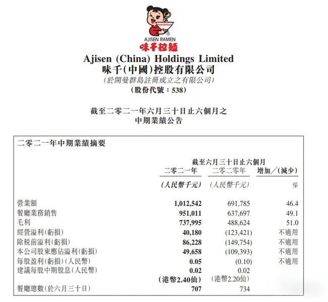 8月底,港股上市公司味千(中国)发布2021年半年报。公司上半年营业额为10.13亿元,净利润4965.8万元。
