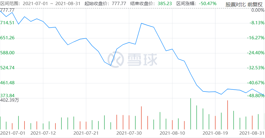 可之后的走势完全就是另一种“哇哦”了。自7月以来,康希诺股价一路狂泻,短暂反弹恐怕只是套住了更多看走眼的投资者。截至8月最后一个交易日,康希诺股价报收385.23元,较798元的高点腰斩,还多饶了一点儿,A股市值也不足1000亿。