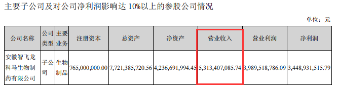 财报显示,智飞生物期内自主产品总营收60.37亿元(同比增长1475%),全资子公司安徽智飞龙科马负责新冠疫苗的研发与生产销售,由于该子公司并无其它实质性在售产品,所以在2021年上半年实现的53.13亿元营收,主要来自新冠疫苗。