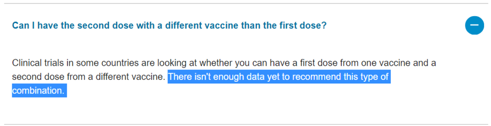 世界卫生组织首席科学家之一,Swaminathan博士则在早先明确表态,“混打”是一种危险的趋势(dangerous trend)。她进一步解释称,至少“混打”疫苗的决定不应由个人决定,而是各国卫生部门依靠数据给出相应决策,但相关数据仍待补充[13]。