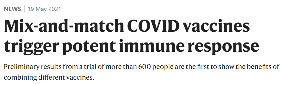 [16] Ewen Callaway. Mix-and-match COVID vaccines trigger potent immune response. Nature 593, 491 (2021) doi: https://doi.org/10.1038/d41586-021-01359-3
