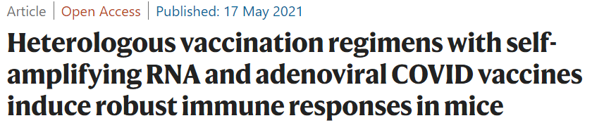 [15] Spencer, A.J., McKay, P.F., Belij-Rammerstorfer, S. et al. Heterologous vaccination regimens with self-amplifying RNA and adenoviral COVID vaccines induce robust immune responses in mice. Nat Commun 12, 2893 (2021). https://doi.org/10.1038/s41467-021-23173-1