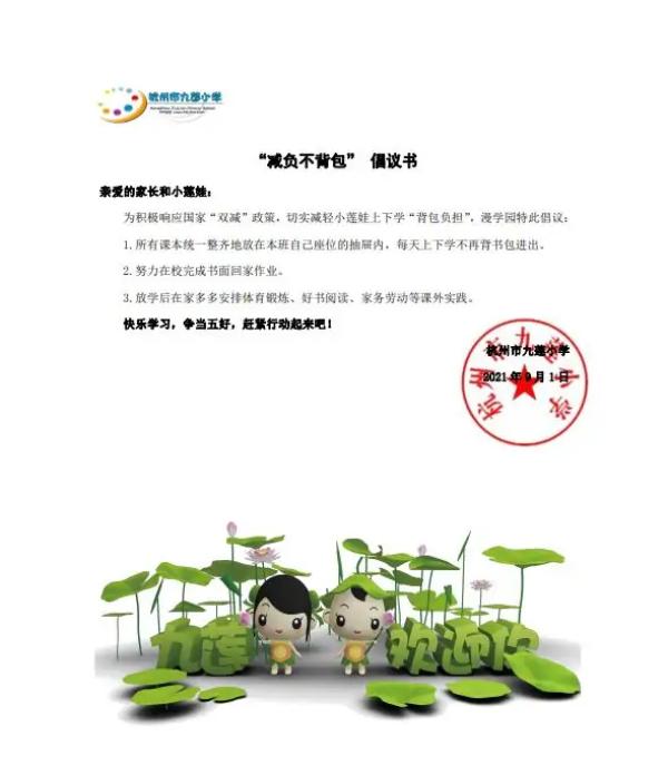 @澎湃新闻【杭州一小学倡议全校上下学不背书包:在校内完成作业、复习】杭州市九莲小学向全体家长和学生发出“减负不背包”倡议书,提倡学生放学后将课本统一放在本班自己座位的抽屉里,上下学不背书包;在校完成书面作业,放学后在家多安排体育锻炼、阅读、家务劳动等课外实践。“倡议书针对的是全校所有年级。”校长蒋晓告诉澎湃,“双减”政策实施后,学生的作业、复习都可在校内完成。