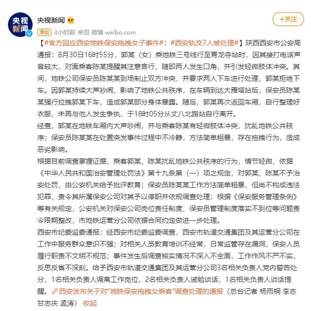 9月2日,西安市发布通报,公布了公安机关的调查结果和纪检监察机关对相关责任人的处理情况,涉事保安员被责令停职调查,西安市轨道交通集团7人被依纪处理。此次事件的处理可谓及时而迅速。