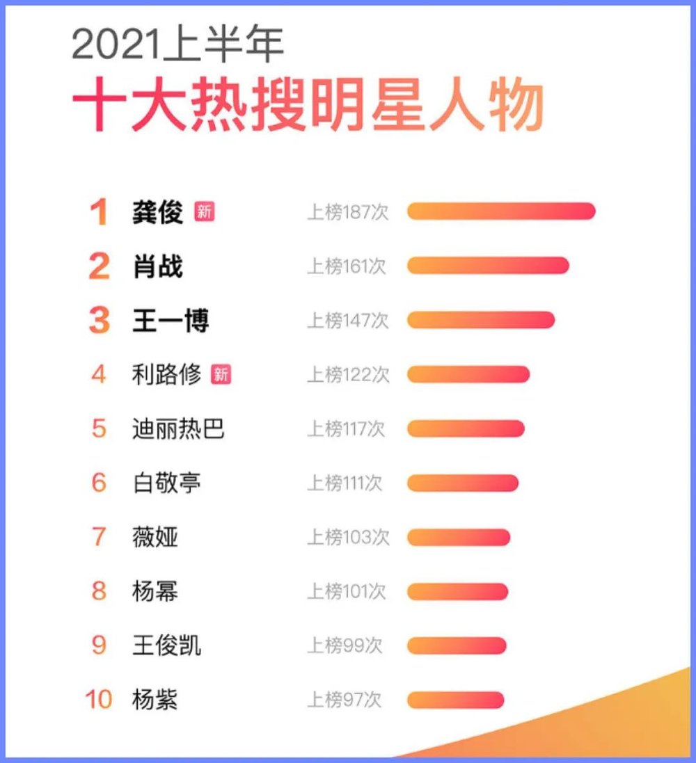 数据显示,在2021上半年热搜人物榜单中,龚俊以187次位列第一,换算一下,平均每天他都会在热搜榜上成为大家的吃瓜对象,而就连排名第10位的杨紫,每1.8天也会与大家在热搜榜上相见。