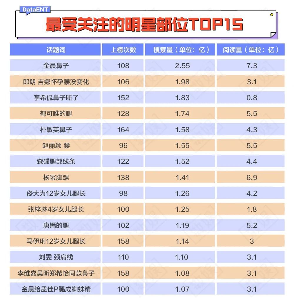 在所有关注明星部位的热搜中,top15的话题词搜索量均超过1亿,超过5亿的阅读量的为#金晨鼻子#、#杨幂脚踝#与#唐嫣的腿#。而金晨除了鼻子这个部位很有热度以外,她的#金晨给孟佳P腿成蜘蛛精#搜索量也位居第15位,成为唯一上榜2次的艺人。