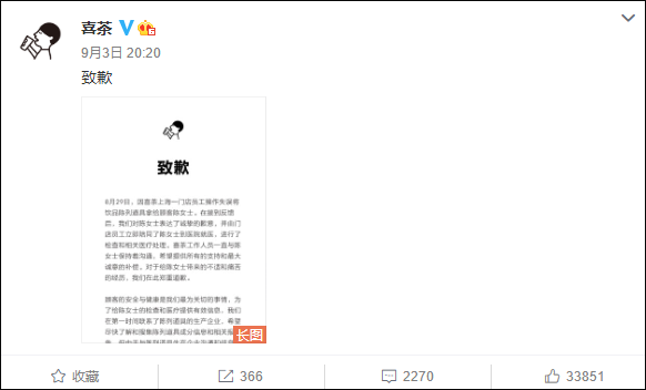 让人感到云诡波谲的是,8月31日,陈女士收到了喜茶人员的慰问短信,里面再次提到了成分问题,此时成分已经被描述为“液态硅胶”。在这次短信沟通中,该喜茶人员表示在陈女士医疗费用之外,还为陈女士初步申请到了8000元的补偿金。当天晚上,陈女士选择报案,此后不久食药监局也已介入本次事件。9月3日晚,喜茶发布了致歉声明,在向陈女士公开道歉之外,喜茶宣布在全国门店下架这款样品。