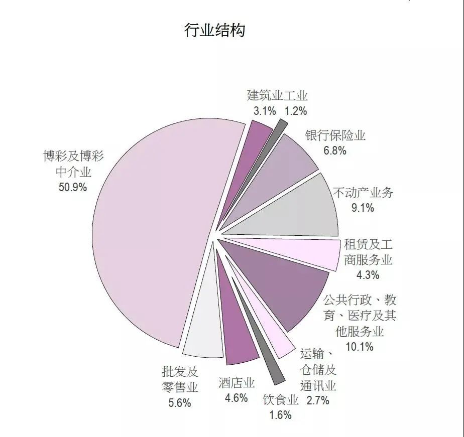 澳门以博彩及博彩中介业为主要支柱产业,2019年占整体行业架构的50.9%。除了博彩旅游业之外,澳门的会展业、金融业、中医药等特色产业发展相对迅猛。