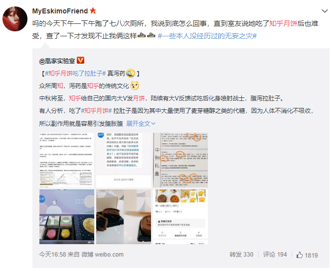 @腾讯新闻【知乎就月饼吃坏肚子致歉:采购经验不足,将召回月饼】9月8日,部分知乎大V反馈,吃了知乎发的月饼出现腹泻拉肚子现象。对此,知乎官方账号回应:向此次事件中涉及到的知友表示最诚挚的歉意。此次月饼知乎委托业内口碑较好的成熟企业进行生产,选择了厂家提供的低糖配方。出厂产品经过生产方和独立第三方机构检测,符合食品行业相关质量标准。“但忽略了用来替代蔗糖的麦芽糖醇可能会导致一部分人不耐受,造成身体不适,这是我们的失误”。