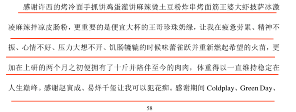无论是麻辣香锅还是烧烤,学生们开始在致谢里感谢任何给自己带来治愈感的事物。