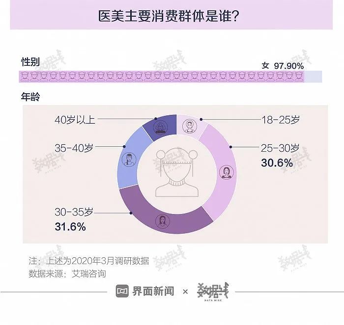 25岁到35岁的女性最爱美。据艾瑞咨询发布的《2020年中国医疗美容行业洞察白皮书》,医美消费人群以女性为主,占97.9%,但还是有2.1%的男性愿意“为脸砸钱”。从年龄上看,“医美大军”的主力集中在25岁到35岁之间。