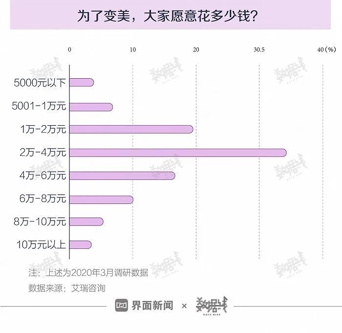 大多数人的医美开销在2万元到4万元之间。舍得花10万元“变美”的人还是少数。