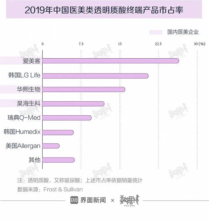 在中国医美玻尿酸市场,国产品牌逐步掌握了主导权。据弗若斯特沙利文数据,2019年,爱美客、华熙生物和昊海生科3家国内玻尿酸生产企业按销售量统计的市占率之和达54.6%。