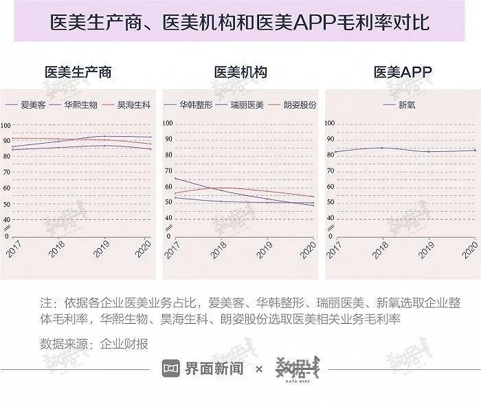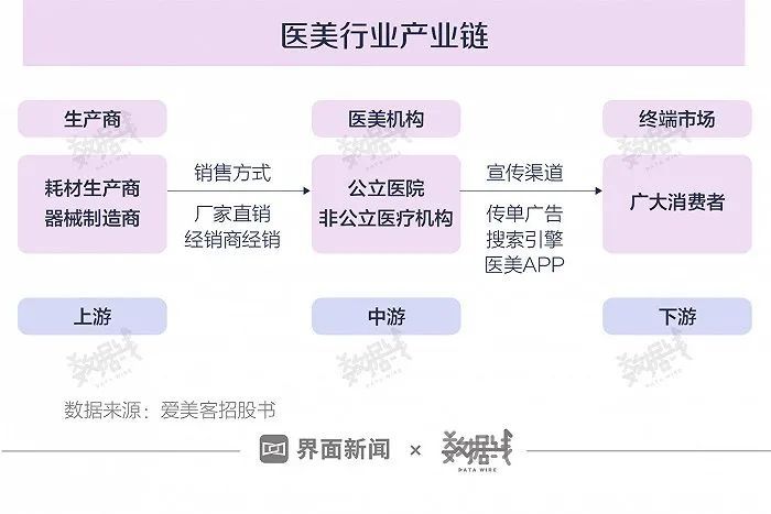 医美产业中,做手术的最不赚钱,医美App其次,上游原材料生产商赚得最多。以注射医美行业为例,界面数据选取上游、中游及下游渠道环节的医美主要上市企业财报进行分析。