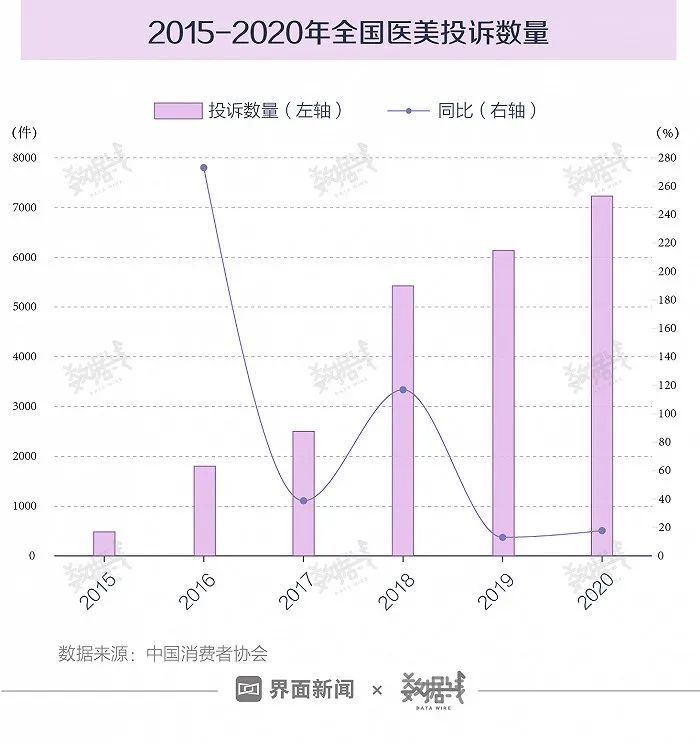 据中国消费者协会官网数据,2015年至2020年,全国医美投诉数量从不足1千件增长至超7千件,连续5年增长14倍。