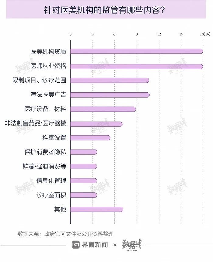 据界面数据不完全统计,1994年至2021年,国家和各监管机构针对医美行业的监管政策文件至少达12份。其中,针对“医美机构资质”和“医师从业资格”的监管分别占近两成。“限制项目、诊疗范围”和“违法医美广告”的管控分别占约1成。
