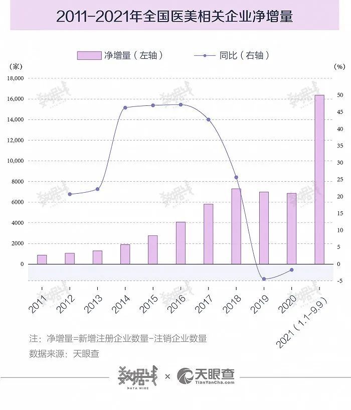 监管之下,医美企业入局情况如何?据天眼查数据,2018年至2020年,全国医美相关企业净增量连续两年下降。但今年以来,医美相关企业出现大幅增加。截至2021年9月9日,全国医美相关企业净增约1.6万家,是2020年全年数据的两倍多。