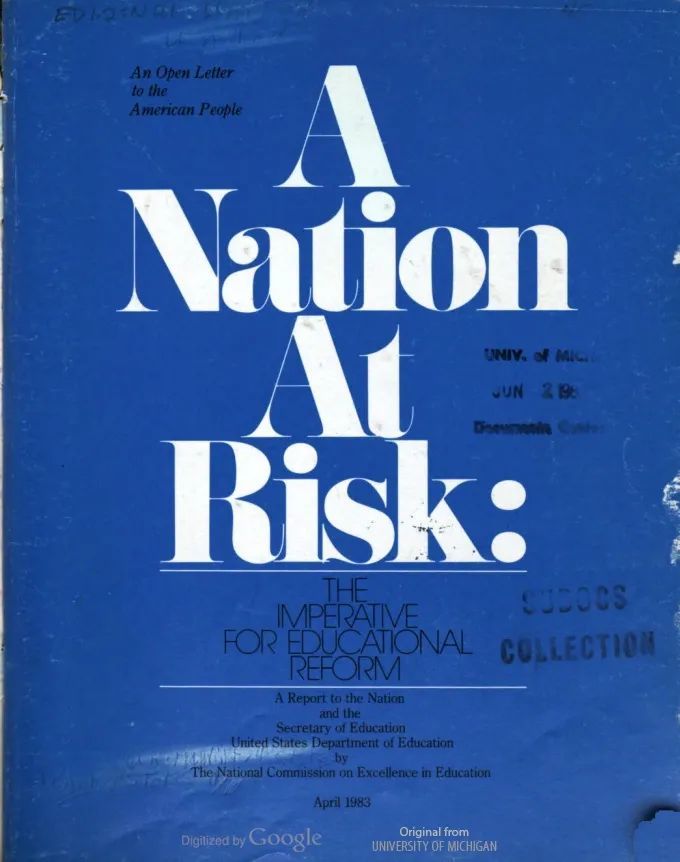1983年,美国政府出台了一份名为“A Nation at Risk”(国家危机)的报告,原文地址:www2.ed.gov/pubs/NatAtRisk/risk.html。图片来源:wikipedia