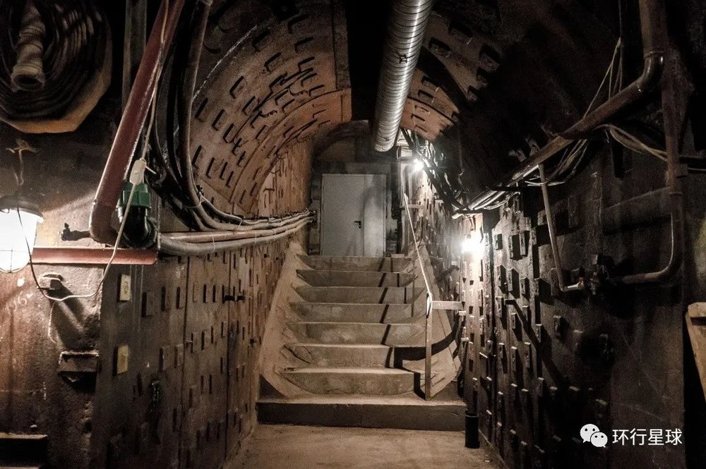 由于“42号地堡”深入地下65米,因此,要想进入地堡,需要乘坐升降机,或者走长长的楼梯下去。