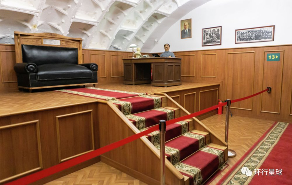42号地堡虽然也叫斯大林地堡,但它在1956年才完工,而斯大林1953年就去世了,所以他本人根本没使用过这间办公室。现在房间仍然按照斯大林风格布置,里面摆放着一张黑色的长沙发,办公桌后面还有斯大林的蜡像。