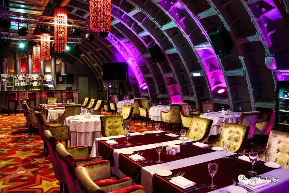 在受了一番刺激和惊吓之后,参观者们此时刚好走到餐厅,自然要平息一下紧张的情绪。隧道的尽头是一间“前苏联风格”的餐厅,这里的主题是红五星,不但地上铺着红五星地毯,穹顶上也有一颗硕大的红五星。