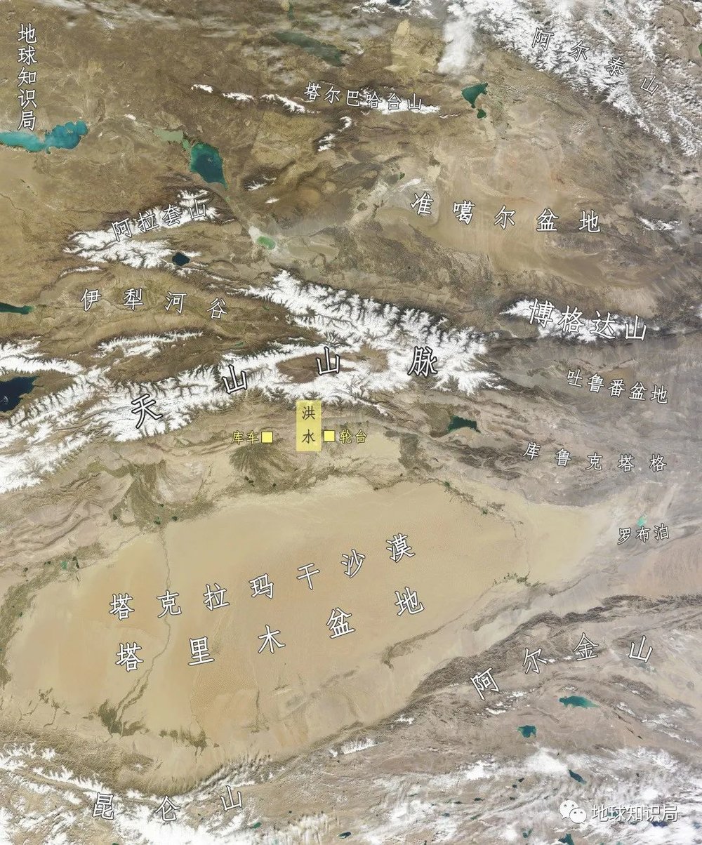 就在天山山脉山脚下,并非在沙漠腹地(底图:NASA)▼