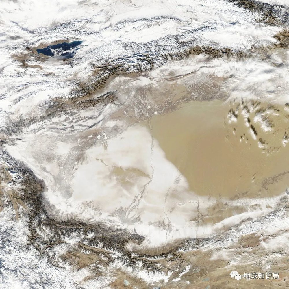 白雪皑皑的天山山脉与南边的沙漠形成了鲜明对比(你一定发现了,这张图是上南下北,(图:NASA)▼