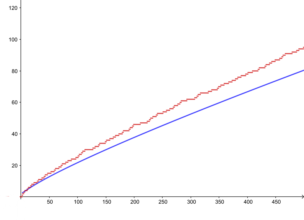 红色曲线显示的是小于或等于n的质数数目,其中横轴表示 n 。蓝色曲线给出 n/ln(n) 的值。真实结果和近似结果之间的差值随着 n 的增长而增加,但两者之间的比值趋于 1 。