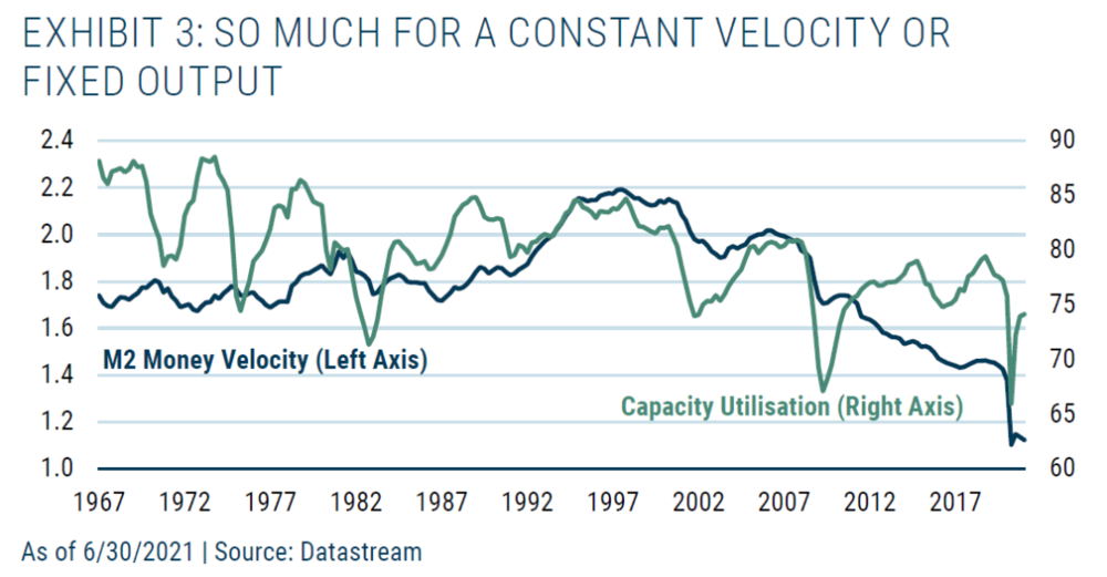 图3. 1967~2021年货币流通速度和经济产量变动图,截至 2021 年 6 月 30 日 | 资料来源:Datastream