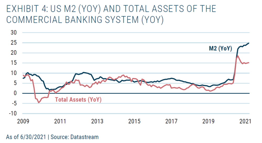 图4. 2009-2021年美国 M2增速和商业银行系统总资产增速图,截至 2021 年 6 月 30 日 | 资料来源:Datastream