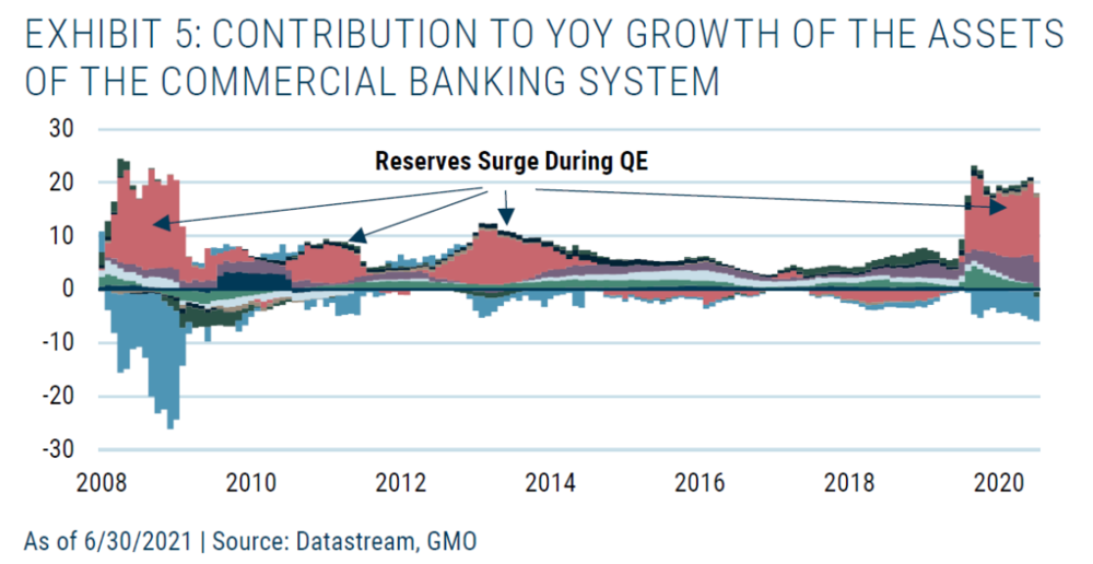 图5. 商业银行系统总资产同比增长中的各部分贡献情况,截至 2021 年 6 月 30 日 | 资料来源:Datastream, GMO