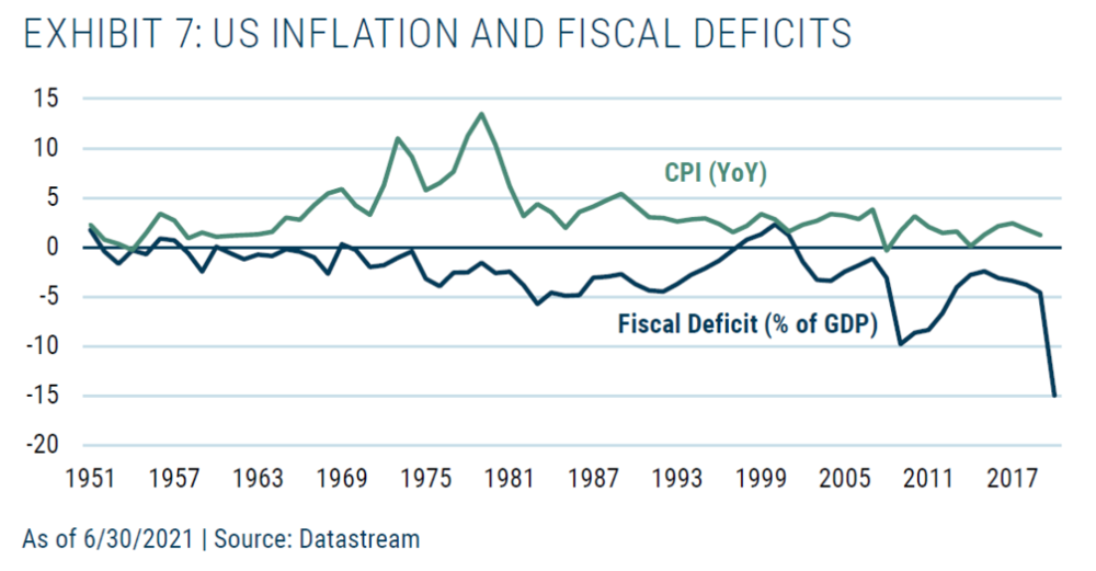 图7. 1951~2021年美国通货膨胀和财政赤字,截至 2021 年 6 月 30 日 | 资料来源:Datastream