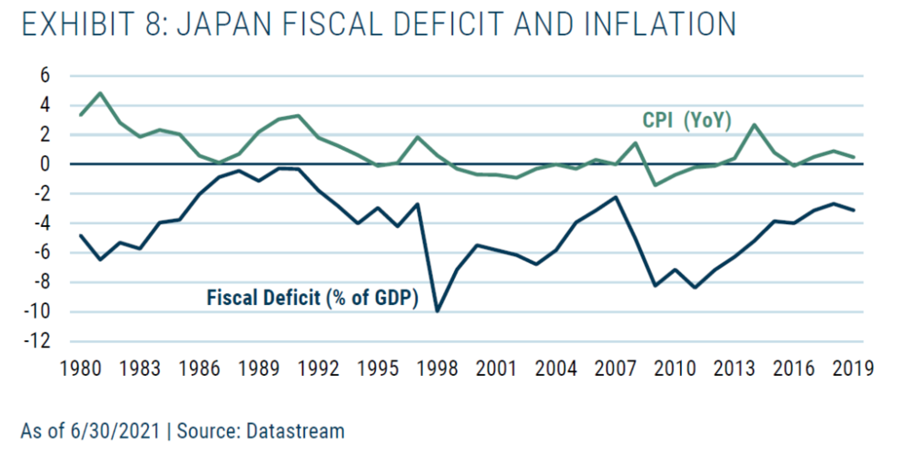 图8. 1980~2021年日本财政赤字和通货膨胀,截至 2021 年 6 月 30 日 | 资料来源:Datastream