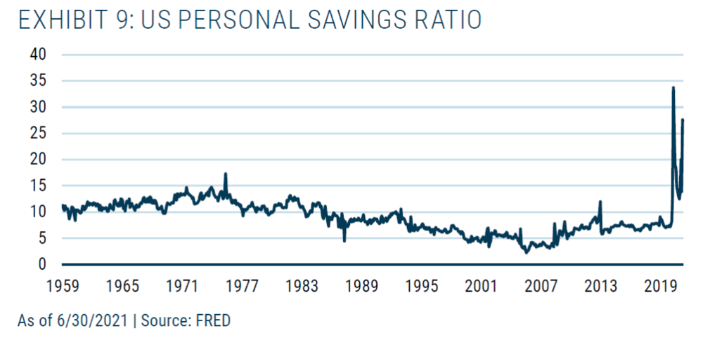 图9. 1959~2021年美国个人储蓄率,截至 2021 年 6 月 30 日 | 资料来源:FRED