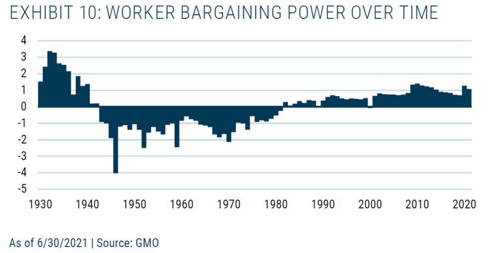 图10. 1930~2020年工人讨价还价能力变化图,截至 2021 年 6 月 30 日 | 资料来源:GMO