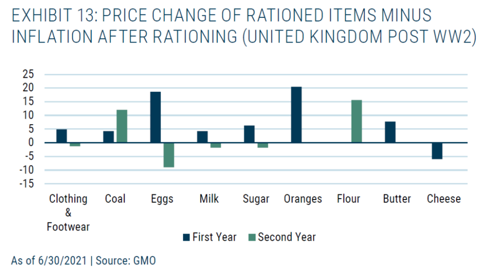 图13. 配给后商品的价格变化减去通货膨胀(二战后的英国),截至 2021 年 6 月 30 日 | 资料来源:GMO