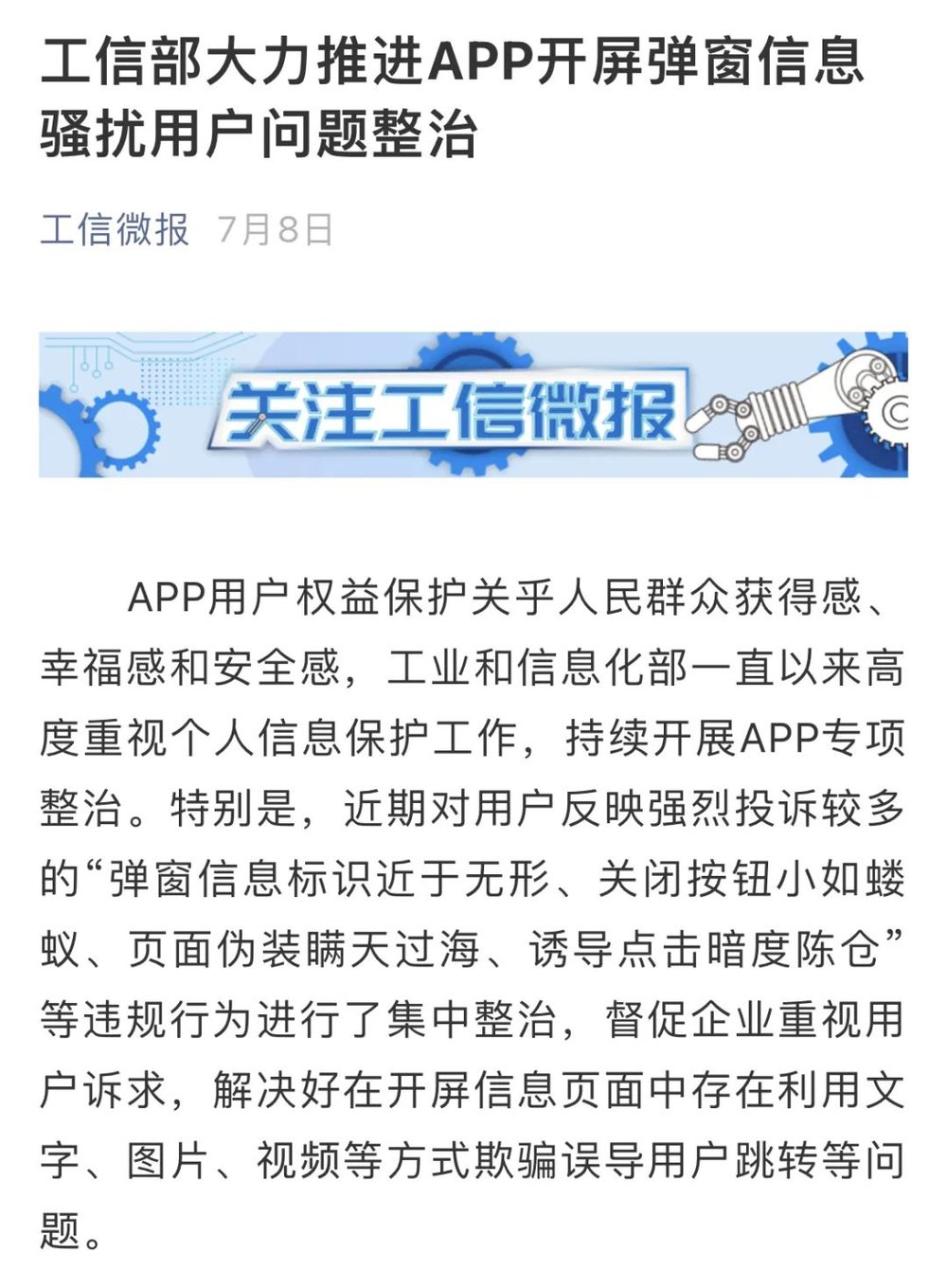 去年,工信部开展APP侵害用户权益专项整治行动,对“设置障碍、频繁骚扰用户”“欺骗误导用户”“应用分发平台责任落实不到位”等问题进行集中排查,要求通报APP整改。今年7月开始,工信部决定开展互联网行业专项整治行动。其中,在侵害用户权益方面,重点整治应用软件启动弹窗欺骗误导用户、强制提供个性化服务等问题,包括弹窗整屏为跳转链接、定向推送时提供虚假关闭按钮等场景。