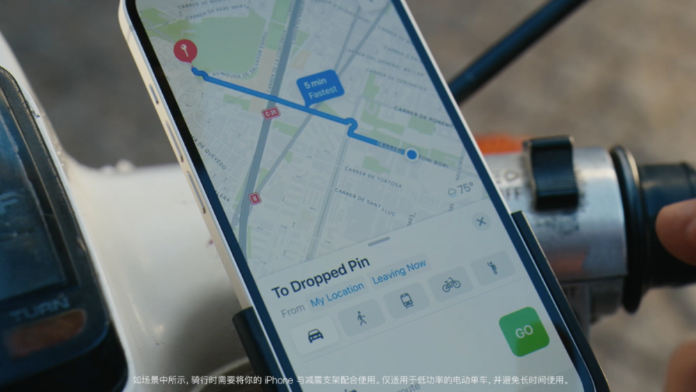 “如场景中所示,骑行时需要将你的iPhone与减震支架配合使用。仅适用于低功率的电动单车,并避免长时间使用。”