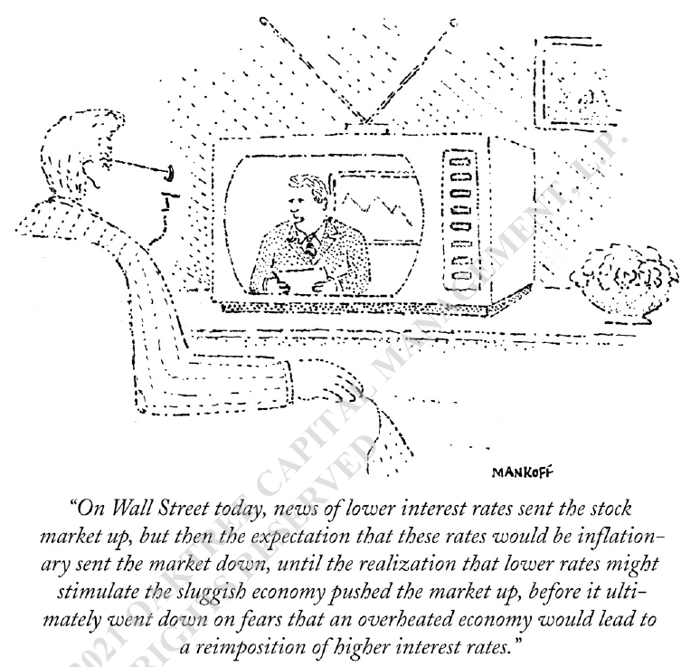 我2016年的备忘录里说到,关于何时买卖证券,“市场没有什么有用的贡献”。我想我们对未来宏观事件的预测也可以说同样的话。也许理解市场思考过程最好是通过这幅老漫画,这是有史以来最伟大的一个漫画,我在备忘录《在沙发上》里提到过。