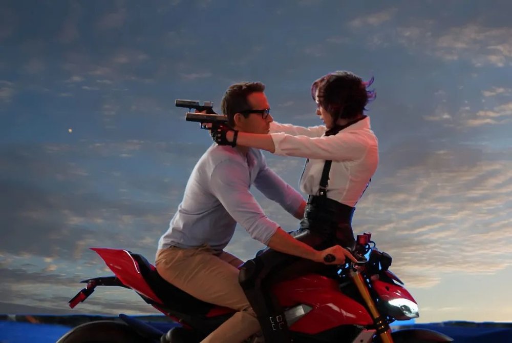 这骑机车的姿势,是致敬阿汤哥与《危情谍战》的彩蛋。/《失控玩家》剧照