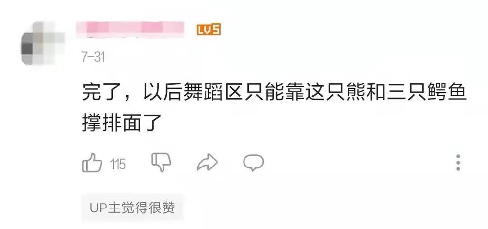 在他的视频评论区,经常有人表示“得找个麻袋把这熊套走”,还有人表示:“以后舞蹈区只能靠这只熊和三只鳄鱼撑排面了”。